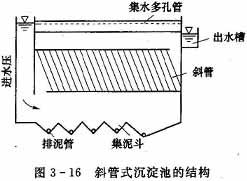 斜管斜板式沉淀池的結構與一般沉淀池相同,是由進口、沉淀區、出口與集泥區四個部分組成,只是在沉淀區設置有許多斜管或斜板。圖3-16為斜管式沉淀池的典型結構。